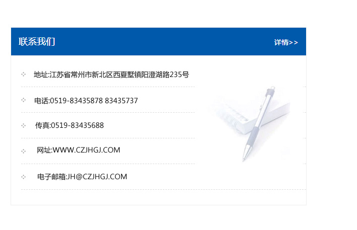 地址:常州市新北區友邦商務大廈1幢16、17層  電話:0519-85101652  傳真:0519-85112595  郵編:213022  網址:www_cz-jiayue_cn.exhicloud.com  郵箱:xiajifengaa@163.com